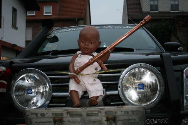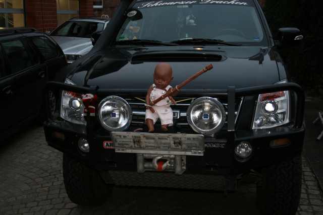 Aufgrund der Fahrzeuggeometrie und -form war das aber leider nicht möglich. Die Kotflügel haben heute eben leider keine - außer beim G und beim Landy - Sitzmöglichkeit mehr. Außerdem hätte der Kerl seine Beine dann vor den linken Scheinwerfer gehangen. Das hätte bestimmt selbst unser relativ schmerzfreier TÜVler nicht abgenickt....