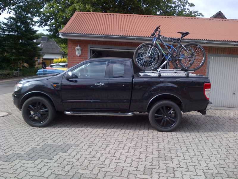 Dadurch dass der Haltearm des ProRide gleichzeitig auch der Befestigungspunkt am Querträger ist, durfte ich den Querträger ein ganzes Stück von der Kabine entfernt befestigen. Die Fahrradträger stehen jetzt ca. 15 cm. über die Heckklappe heraus. Die Vorderräder der Fahrräder haben ca. 2 cm Platz zum WT-Bügel. Die Fahrräder andersrum zu befestigen war keine Option. Dann hätten sie noch weiter über die Heckklappe herausgestanden.
