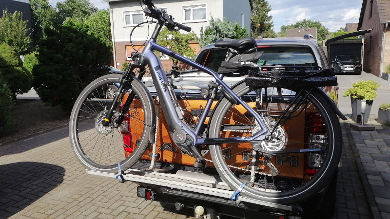 Das Problem bei E-Bikes sind dann noch die Rahmenform zur Befestigung (da muss man mit den Trägern über der Pritsche ordentlich fummeln, bis das gut passt……..und natürlich das Gewicht. Unsere 4 Fahrräder schwanken da schon ganz schön und die Träger biegen sich dabei gut durch, Trotz zusätzlicher Gurte und Verzurrungen.