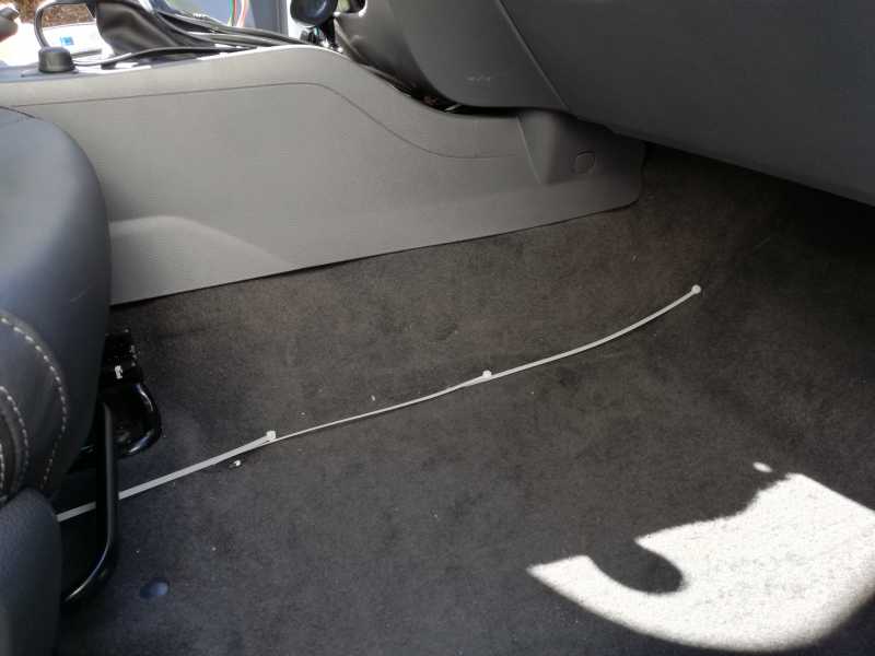 Hier sieht man, mit Kabelbindern angedeutet, wo die "+" Leitung durchgelegt ist, sie kommt von der schon mal beschriebenen Muffe zum Motorraum, geht dann unter dem Radio auf Teppichhöhe von Fahrer- zur Beifahrerseite, fixieren mit Kabelbindern und Panzertape würde ich empfehlen.