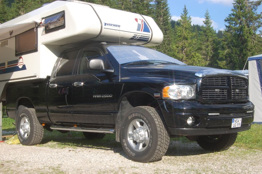 Also, der Dodge von meinem Kumpel ist ein 2500er RAM mit dem 5,7er Hemi-V8. Die Lampen auf dem Dach sind normalerweise gelb, er hatte sie nur abgeklebt, da irgendwo Wasser in den Innenraum eintrat - und er dachte, das käme von einem der Lampen! Die Dinger gibts aber auch in weiß, sieht auch nicht schlecht aus!