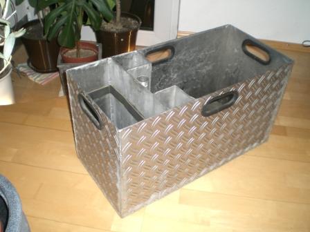 Die große hat die Maße: 300 breit / 350 hoch / 650 lang. Der Boden ist gummiert, in das kleinere Fach passt ein 10l Blechkanister, die Abtrennungen im Hauptfach passen für Dosen oder Flaschen, das kleine Rohr nimmt einen Ausgießer auf, auch hier alles durchgeschweißt falls mal was ausläuft.