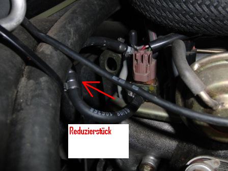 Zusätzlich kommt ein Reduzierstück in die Steuerleitung zum Drucksensor. Das hat den Grund, dass der Ladedruck etwas zeitverzögert ansteigen soll. Quasi wird das Steurgerät etwas veralbert.