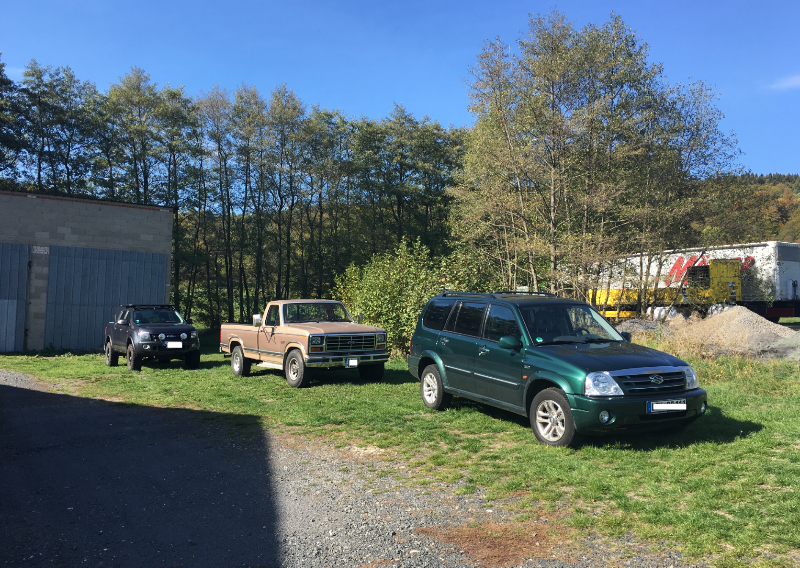 sitze gerade bei diesem tollen Wetter im Büro. Mist! Gestern Abend konnte ich aber noch ein bisschen zum Spaß durch die Herbstsonne fahren. Anbei noch ein Bild vor unserer Halle. Unser Suzuki Grand Vitara in der leider schon lange nicht mehr gebauten XL-Version hat noch den V6-Motor mit 2,7 Liter. 210.000 Km und nichts dran außer normalen Verschleißteilen! Im Gelände auch richtig gut.